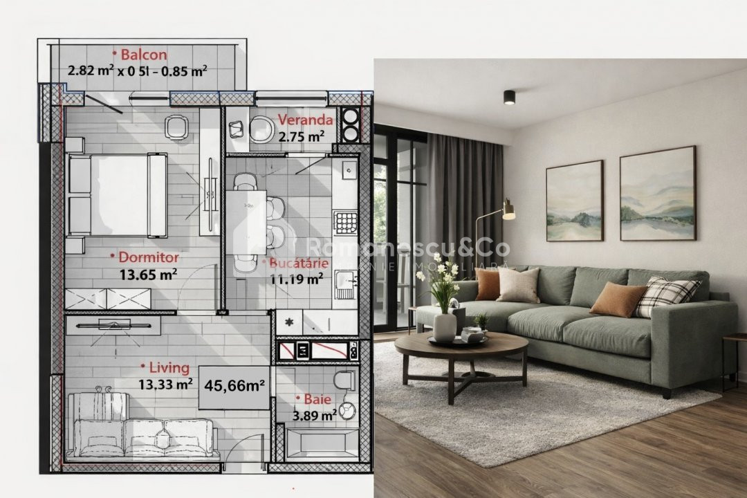 Acest apartament de 45,66 m² este ideal pentru locuit sau investiție. Este compartimentat în: