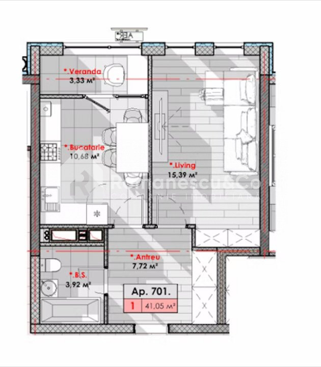 Общая площадь квартиры — 41,05 м², планировка включает: 1 комнату, кухню, санузел, прихожую и балкон.